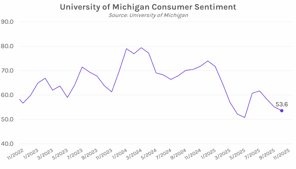 Daily Market Color November 7, 2025Consumer Sentiment Nears All-Time Low Yields close flat despite weak consumer sentiment. Treasury yields declined ~3 bps on weak University of Michigan consumer sentiment, which dropped near the lowest levels on record (50.3 from 53.6 last month). The decline reversed later in the afternoon, and yields closed nearly unchanged with the 2-year yield at 3.56% (a 1bp decline on the week) and the 10-year yield at 4.10% (a 2 bp increase on the week). Meanwhile, the S&P 500 and NASDAQ sold-off this morning but closed 0.13% higher and 0.21% lower, respectively, on optimism that the government shutdown will end soon. Michigan consumer sentiment posts near record low. University of Michigan consumer sentiment dropped to near record lows in November, according to preliminary data. Headline sentiment fell to 50.3, down from last month’s 53.6 and below expectations of 53.0. Confidence in current conditions hit a record low, dropping 6.3 points to 52.3 and well below expectations of 59.0. Today’s data showed consumer sentiment falling across age, income, and political demographics in the US, with confidence among democrats and independents hitting its lowest level since 1984. The only bright spot was long-term inflation expectations, as the 5-10-year inflation outlook fell to 3.6%, down from 3.9% in October, although short-term inflation expectations edged up from last month’s 4.6%, to 4.7%. On the whole, the broad decline in US consumer sentiment has been largely fueled by uncertainty due to the ongoing government shutdown. Vice Chair Jefferson says Fed should move cautiously. Fed Vice Chair Philip Jefferson today shared his support for the Fed’s October rate cut, citing cooling in the labor market, although he expressed the need for the Fed to make future policy decisions hesitantly. He now views the current policy rate as “somewhat restrictive,” and acknowledges that inflation remains persistently elevated, driven by US tariff policy. Jefferson sees signs that inflation will gradually move closer to the Fed’s 2% target and views the labor market’s stability as uncertain due to AI. As a result, Jefferson explained that “it makes sense to proceed slowly as we approach the neutral rate” and did not share whether he would support another rate cut at the upcoming FOMC meeting in December.
