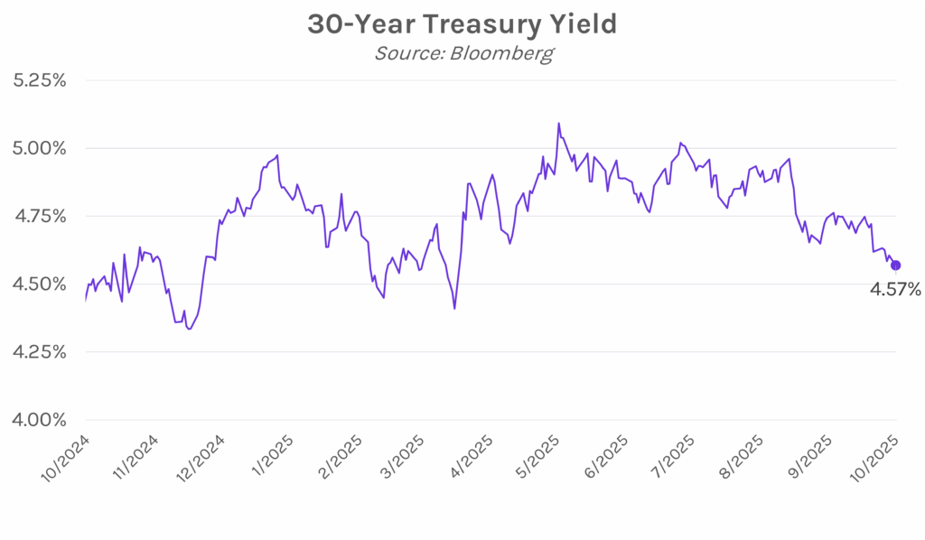 Longer-dated yields edge lower amid falling oil prices. UST yields traded in a tight 3-4 bp range today in the absence of economic data and Fed commentary. The front end of the curve ended flat, with the 2-year yield at 3.45%. Meanwhile, the longer-end declined as lower oil prices helped relieve inflation concerns, which comes ahead of delayed CPI data on Friday. The 10-year yield declined 3 bps on the day to 3.98% while the 30-year yield declined 4 bps to close at 4.57%. Elsewhere, equities rallied as a strong earnings season continues, with the S&P 500 and NASDAQ closing 1.07% and 1.37% higher.