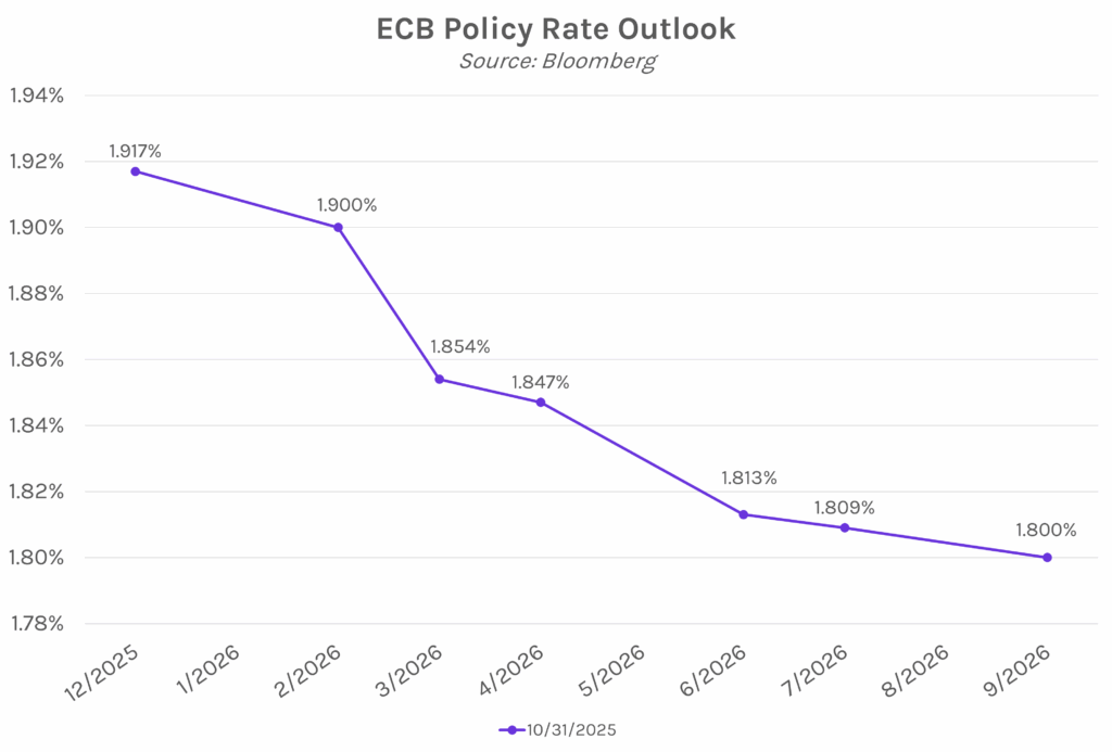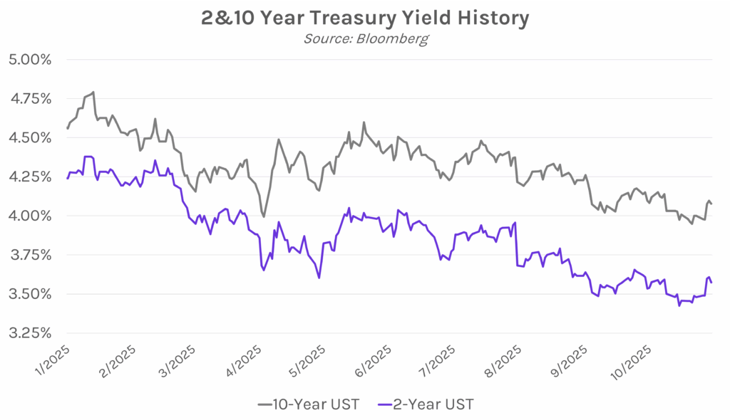 Daily Market Color October 31, 2025Fed Officials Debate Policy Path Forward Yields decline as markets digest Fed path forward. Treasury yields traded in a 3-4 bp range for most of the session as markets continue to digest Chair Powell’s hawkish FOMC press conference alongside mixed commentary from Fed officials today. Yields declined ~2 bps in the final hour of the day, with the 2-year yield closing 3 bps lower at 3.57% and the 10-year yield 2 bps lower at 4.08%, both a 8-9 bp increase on the week. Meanwhile, equities rose today, with the S&P 500 and NASDAQ climbing 0.26% and 0.61%, respectively, driven by positive earnings outlooks from Amazon and Apple. Fed officials have mixed opinions on recent rate cut and outlook. Following the Fed’s 25 bp rate cut earlier this week, several Fed officials voiced differing views on the decision and path ahead. Dallas Fed President Lorie Logan, Cleveland Fed President Beth Hammack, and Kansas City Fed President Jeff Schmid all preferred to leave rates unchanged. Schmid, a FOMC voter, stated, “By my assessment, the labor market is largely in balance, the economy shows continued momentum, and inflation remains too high.” Logan echoed this, saying she “did not see a need to cut rates this week,” while Hammack described the new benchmark rate as neutral but emphasized that policy should stay restrictive to control inflation. In contrast, Atlanta Fed President Raphael Bostic supported the cut, citing his view that the current rate is still restrictive. Fed Governor Christopher Waller backed further easing, saying “We know inflation is going to come back down, so this is why I’m still advocating that we cut policy rates in December, because that’s what all the data is telling me to do.” Euro-Zone inflation falls slightly as ECB holds rates. Eurozone inflation eased slightly in October, coming in right around 2%, though just above the ECB’s official target. The figures showed consumer prices rose 2.1% from last October but declined slightly from September’s 2.2%. A measure of underlying inflation that excludes volatile items such as food and energy held steady at 2.4%, but the services component rose to 3.4%. The ECB continues to project that inflation will fall below its 2% goal next year, and these latest inflation figures support the central bank’s decision to keep interest rates unchanged at 2% for the third consecutive meeting. Reflecting this concern, Joerg Krämer, Chief Economist at Commerzbank, stated that “the persistent underlying inflation argues against the ECB lowering its key interest rates.”