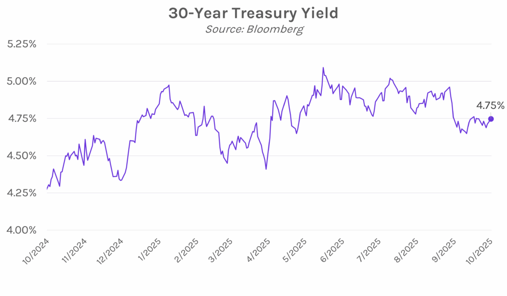 Longer-dated yields edge higher on European fiscal concerns. UST yields traded within a 4 bp range today as markets remained quiet amid the US government shutdown. The long-end of the curve saw relatively elevated volatility after France’s new Prime Minister, Sebastien Lecornu, announced his resignation. This comes as the politically fragmented French parliament refuses to compromise, heightening Lecornu’s lack of confidence in getting a new budget approved. France’s 30-year government bond yield momentarily hit a 1-month high of 4.44%, and the move largely fueled a 3-4 bp climb in 10, 20, and 30-year UST yields. The 10-year yield and 30-year yield closed at 4.15% and 4.75%, respectively. Meanwhile, equities rallied today on strength in AI chipmakers following a deal between Advanced Micro Devices and OpenAI, which sent AMD climbing 23.71% and the NASDAQ up 0.71%.