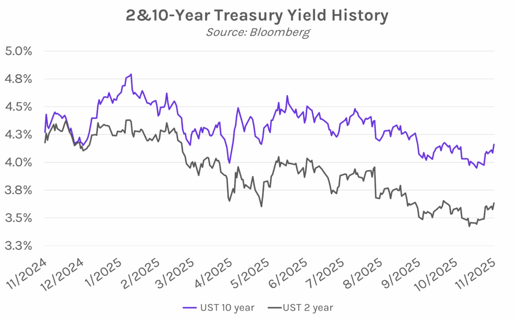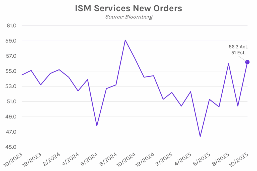 Daily Market Color November 5, 2025ISM Services Sees Strongest Growth in Eight Months Yields rise as services data show strong growth. Treasury yields declined ~3 bps overnight but reversed course this morning on private payrolls data that showed 42k jobs added in October, a bullish sign after declines in the two months prior. The move accelerated after ISM services data showed that the US services sector expanded quicker than expected in October, with yields ~4 bps higher in the aftermath. The 2-year yield ultimately closed 5 bps higher at 3.63% and the 10-year yield 7 bps higher at 4.16%. Meanwhile, equities rebounded after sliding yesterday on AI valuation worries, with the S&P 500 and NASDAQ rising 0.37% and 0.65%, respectively. US services sector expands at fastest pace in eight months. The ISM services index rose to 52.4 in October, above expectations of 50.8 and rebounding from 50 in September, a level that signals stagnation. 11 out of 17 services industries expanded last month, led by growth in accommodation and food services, alongside retail trade and wholesale trade. Growth was driven by a surge in new orders, which climbed to 56.4 from 50.4 in the prior month, marking a one-year high. Meanwhile, prices continued to increase, with the prices paid gauge hitting 70, up from 69.4 in September. Inflationary pressures from tariffs remain top-of-mind, as Steve Miller, the chair of the ISM Services Business Survey Committee, said, “Respondents continued to mention the impact of tariffs on prices paid.” Supreme Court justices express skepticism on Trump tariff authority. Oral arguments were heard today in the case brought by democratic states and small businesses against the Trump Administration’s sweeping tariff policies. Conservative justices expressed skepticism of Trump having broad authority to impose import duties, suggesting the Court may be inclined to uphold the lower court ruling that struck down the tariffs. The Department of Justice argues the President has broad economic authority during times of emergency, thereby allowing country-wide tariffs such as the ones Trump imposed on ‘Liberation Day’ in April. If the Supreme Court rules against the President, he would no longer have unbounded tariff authority, but would still have widespread power under other acts. A ruling from the Supreme Court may take weeks or months, but if the levies are struck down, it could result in the government having to refund some $100 billion in tariff revenue collected over recent months, and would also likely propel many countries to renegotiate their trade agreements with the US.