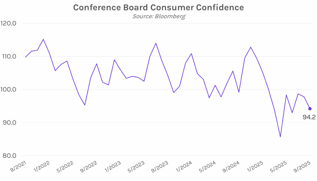 Yields roughly unchanged after consumer confidence, labor data. UST yields fell ~2 bps immediately after this morning’s consumer confidence data, which was the weakest in five months, and JOLTS job openings data which were little changed from August, but the move later reversed and yields steadily climbed to end the day roughly unchanged. Today’s JOLTs report may be the last insight into the jobs market for the foreseeable future, as a potential government shutdown, starting tomorrow, could delay upcoming data releases. The 2-year yield ended 1bp lower at 3.62%, while the 10-year yield rose 1bp, closing at 4.15%. Meanwhile, equities rose today, with the NASDAQ up 0.30% and the S&P 500 up 0.41% to close out its second best September performance in 15 years.