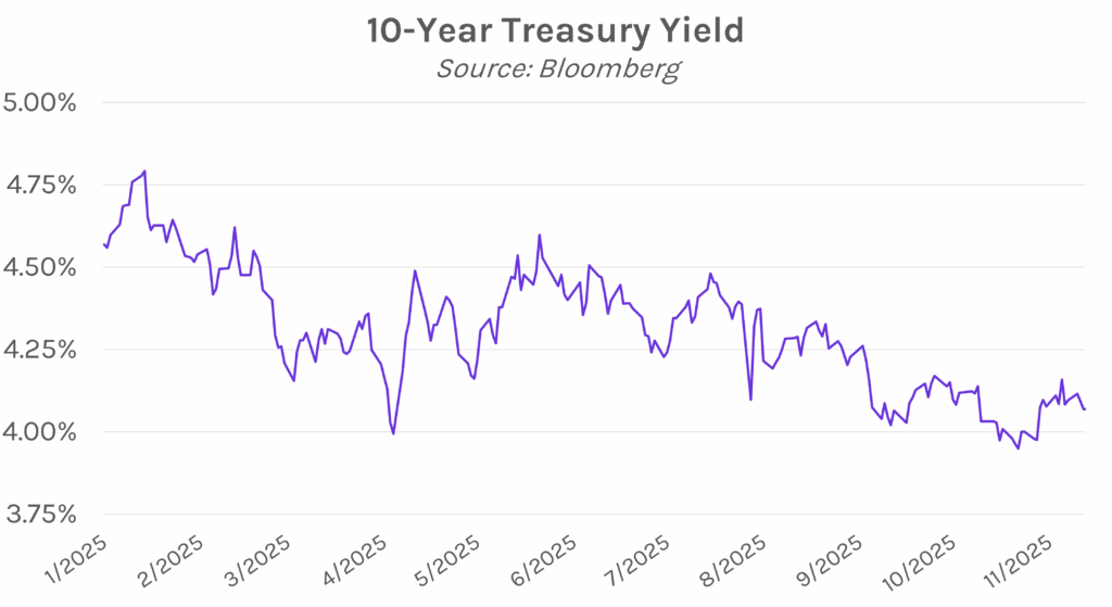 Yields decline ahead of House vote to end government shutdown. Treasury yields edged lower ahead of tonight’s House vote to end the government shutdown, where a simple majority is needed to pass the funding bill. The government re-opening should put the spotlight back on the December FOMC meeting, as some delayed economic data is expected to be released shortly after. The 2-year yield closed 2 bps lower at 3.57% and the 10-year yield closed 5 bps lower at 4.07%. Meanwhile, equities were mixed today, with the DJI hitting a new all-time high of 48,432 and the NASDAQ down 0.26% after some tech mega caps fell.