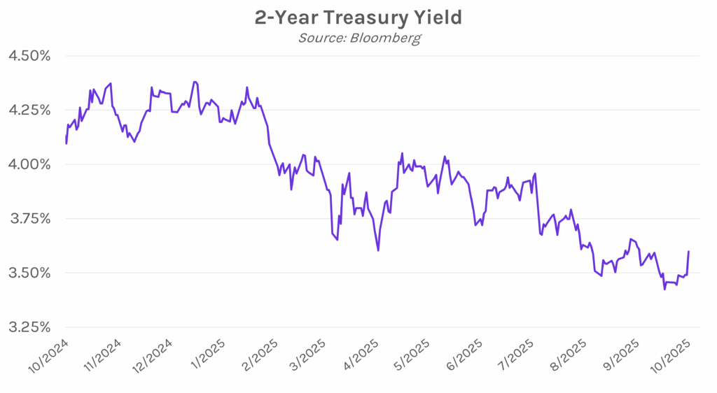 Fed makes second consecutive quarter point cut. The October FOMC meeting concluded today with members voting 10-2 to cut interest rates by a quarter point, setting the new target range at 3.75% – 4.00%. The two dissents fell on opposite sides of the spectrum, with Miran dissenting in favor of a 50 bp cut and Schmid in favor of holding rates unchanged. Today’s policy easing was fueled by the softening labor market, as the Fed statement acknowledged that “risks to employment rose in recent months” while highlighting persistent inflation and referring to economic growth as “moderate.” The Fed also announced they will stop shrinking their balance sheet beginning in December, having shed more than $2 trillion in Treasuries and mortgage-backed securities since 2022. The full FOMC statement with a side-by-side comparison from the last meeting can be read here.