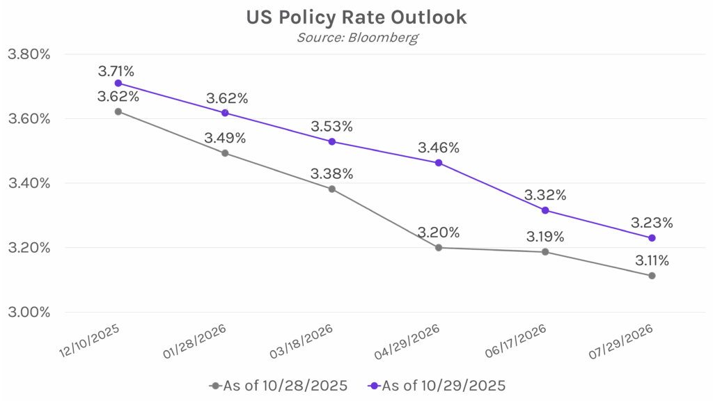 Powell puts December rate cut in question. In today’s post-meeting conference, Fed Chair Jerome Powell cast doubt on the potential for another rate cut in December, saying that “A further reduction in the policy rate at the December meeting is not a foregone conclusion, far from it.” Powell’s cautious approach is largely driven by concerns about inflation and the potential for tariffs to fuel “more persistent” price pressures. The lack of fresh economic data (due to the government shutdown) is also creating obscurity, though Powell noted that economic impacts from the shutdown should reverse. Futures markets are now only pricing in a ~69% chance of a 25 bp cut in December, down from ~92% yesterday.