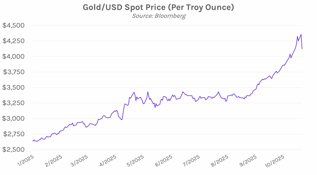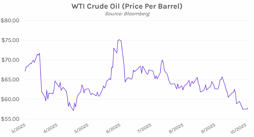 White House announces purchase of 1 million barrels of crude oil. President Trump today announced a plan to purchase 1 million barrels of crude oil, in a move to replenish the US’s depleted emergency supply. American oil reserves are currently only about 60% full, or roughly 408 million barrels, and the Trump Administration described the announcement as an “important step in strengthening our energy security.” The purchase comes as oil prices traded at around $58 a barrel today, the lowest price since 2021 and down 30% since January. The oil will be bought using some of the $171 million allotted to crude oil spending under President Trump’s signature tax bill. Bids for the Energy Department’s 1-million-barrel order will be due by 11 am on October 28th, to be delivered in December and January.