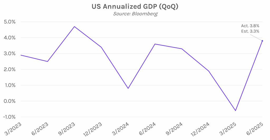 US GDP sees fastest growth in almost two years. US GDP grew 3.8% in the second quarter on an annualized basis, above expectations of 3.3% and marking the fastest growth in almost two years. Today’s figure was an upward revision from initial estimates of 3.0% in July and marked a notable rebound after Q1’s 0.5% contraction due to a tariff-related import surge. Digging deeper, the results were largely driven by higher consumer spending and business investment, which were up 2.5% YoY and 7.3% YoY, respectively. Despite recent labor market concerns, the Atlanta Fed expects robust economic output to continue through the third quarter, estimating growth for the period from July to September at 3.3% on an annual basis. The BEA will release initial Q3 GDP estimates on October 30th, the day after the next FOMC meeting.