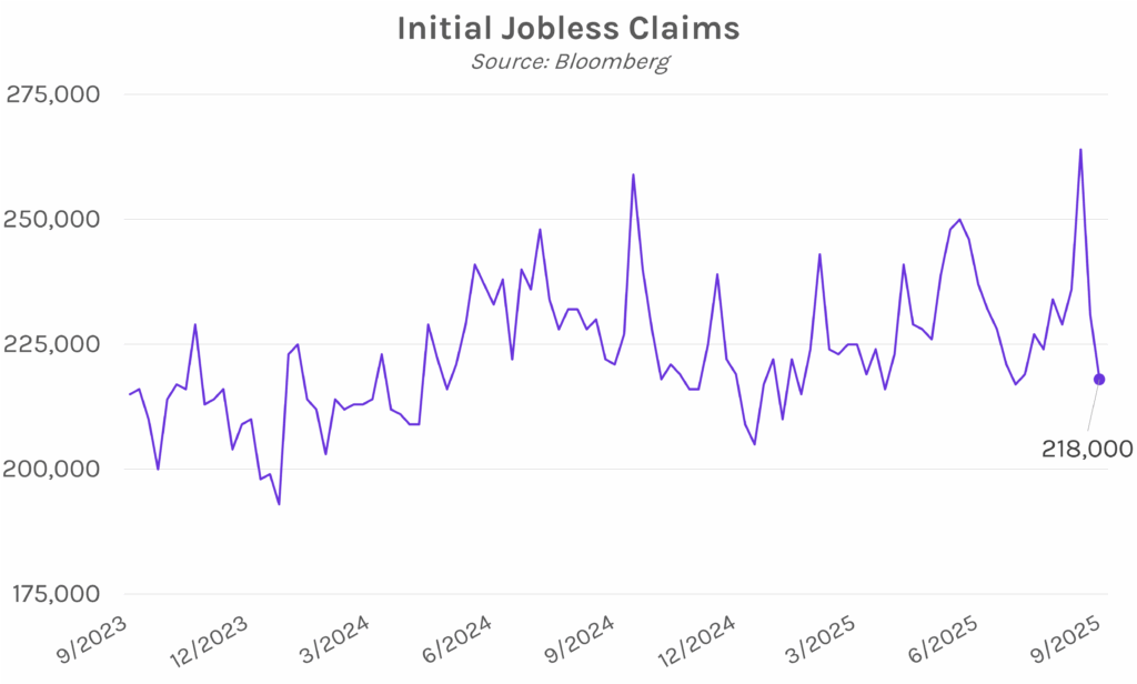 Fed Governor Miran continues his push for aggressive rate cuts. Today Fed Governor Stephen Miran, who dissented at last week’s FOMC meeting in favor of a 50 bp cut, spoke again about why he favors a series of large cuts to support the economy. Despite believing that the economy and labor market is not about to “fall off a cliff,” Miran voiced his preference to “act proactively and lower rates…ahead of time, rather than wait for some giant catastrophe to occur.” Miran views the current policy rate as highly “restrictive” and believes that by not undertaking large rate cuts in the upcoming months, the Fed risks damaging the economy. Miran’s aggressive view is an outlier among the Fed and in glaring opposition to recent remarks by Fed members Musalem, Bostic, and Hammack, and Powell who have indicated a more cautious, meeting-by-meeting approach to their policy view.