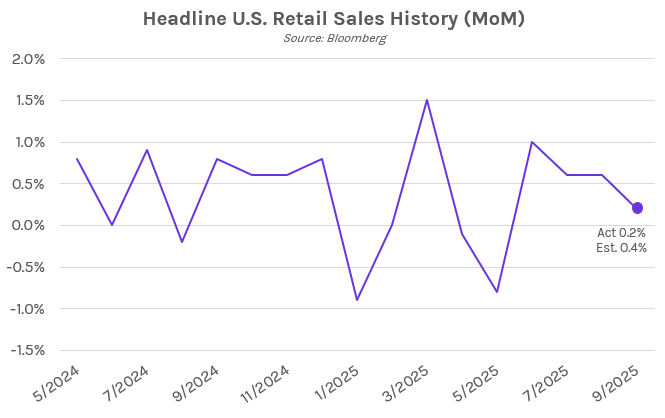 Retail sales data points to consumer tariff fatigue. Headline retail sales rose just 0.2% in September, below estimates of a 0.4% increase and August’s 0.6% rise. Excluding cars and gasoline, retail sales were up just 0.1% MoM, falling short of expectations of a 0.3% increase. Today’s September figures were originally supposed to report in October but were delayed by the government shutdown. The data suggest that consumers are starting to feel the impact of higher prices caused by tariffs and remain concerned about the state of the labor market, as the unemployment rate sits at a 4-year high.