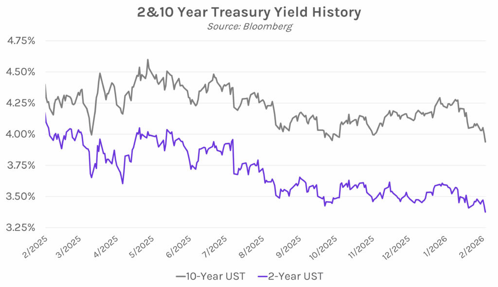 Yields tumble as risk-off sentiment continues. Treasury yields declined throughout the session today as artificial intelligence and geopolitical uncertainty reduced risk appetite. Yields closed 3-7 bps lower across the curve, with the 2-year yield at 3.37% (a 10 bp decline on the week) and the 10-year yield at 3.94% (a 15 bp decline on the week). Meanwhile, equities sold off on tech bubble anxiety, with the S&P 500 and NASDAQ closing 0.43% and 0.92% lower, respectively. With today’s decline, the S&P 500 saw its biggest monthly loss since March. Oil prices surged today as United Nations atomic inspectors revealed that Iran was conducting some activity at bombed uranium-enrichment sites.
