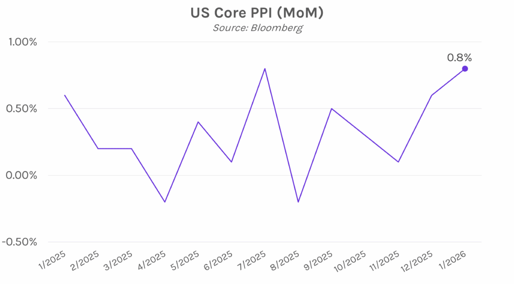 Producer prices continue to rise on services costs. The producer price index in January increased 0.5% month-over-month, the biggest jump since September, as December’s PPI reading was revised downward from 0.5% to 0.4%. Meanwhile, core PPI, which excludes food and energy, saw its biggest advance since July, at 0.8% against 0.3% estimated. Wholesale prices have continued to rise as tariffs on imported goods motivate producers to raise prices to protect their margins. January’s PPI reports adds to evidence that inflation is remaining sticky, with many of the components of the data also used in the PCE price index, the Fed’s preferred inflation gauge.