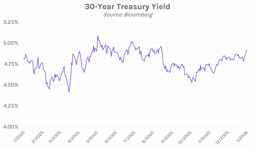 Yields rise on European tariff and Japan bond chaos. The yield curve steepened significantly today with the long-end up 10 bps overnight as fiscal concerns in Japan triggered a bond selloff that rippled into US markets. Tensions with Europe over Greenland also contributed, as Trump threatened tariffs on various European nations and news emerged that a Danish pension fund plans to exit Treasuries. The 2-year yield closed 1bp higher at 3.60%, while the 10-year yield and 30-year yield closed 7-8 bps higher at 4.29% and 4.92%, respectively. Meanwhile, equities saw their worst session since Liberation Day last April, with the S&P 500 down 2.06% and the NASDAQ down 2.39%.