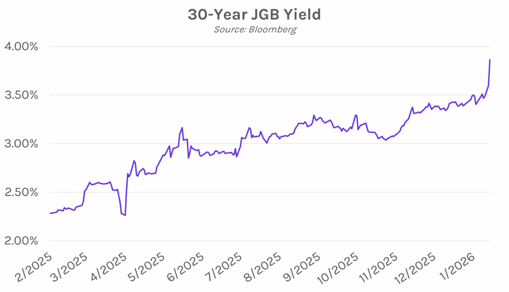 Japan bond selloff pushes yields to highest level in decades. Longer-dated Japanese bonds soared today, with 30- and 40-year yields climbing more than 25 bps, as a snap election called by Prime Minister Sanae Takaichi spurred concerns of looser government spending. Takaichi pledged to suspend an 8% sales tax on food and beverages if her new mandate wins in the snap election, a measure that the Finance Ministry predicts would cost roughly $31.6 billion annually and would be largely funded through government debt issuance. Following the selloff, Japanese Finance Minister Satsuki Katayama said, “I’d like everyone in the market to calm down,” citing Japan’s fiscal responsibility as it currently has its lowest reliance on debt issuance in 30 years and the smallest fiscal deficit among G7 economies.