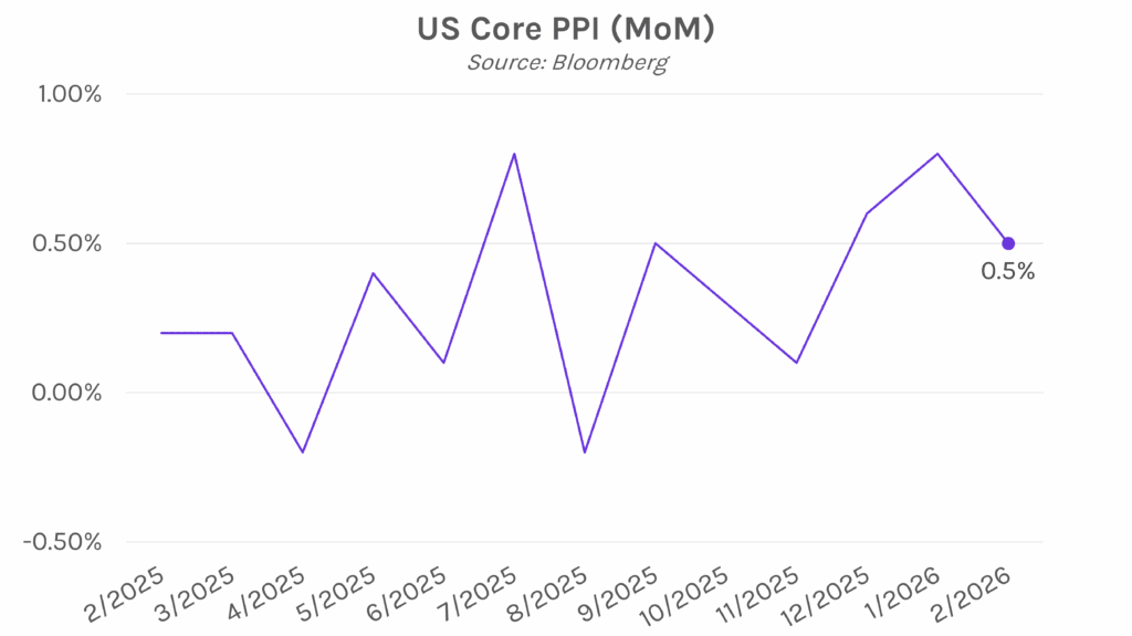 Producer Price Index posts surprise increase. Headline and core MoM PPI unexpectedly jumped 0.7% and 0.5% in February, respectively, versus forecasts of 0.3%. Notably, the February data excludes impact from the Iran conflict; Thomas Ryan, an economist at Capital Economics, said, “The large upside surprise to the PPI in February confirms that stronger inflationary pressures were already making their way through supply chains even prior to the surge in oil prices.” The advance was largely driven by increases in services costs, such as travel accommodations, food wholesaling, and investment services. Food prices also saw the biggest increase since 2021, due to a surge in vegetable prices.