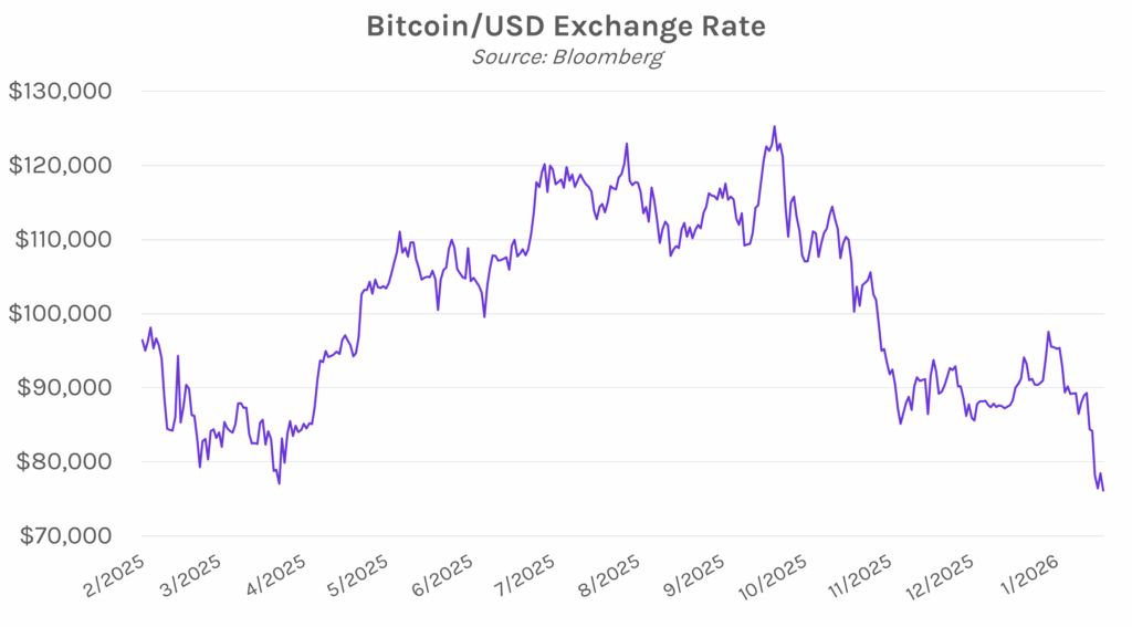 Yields inch lower as markets shift risk-off. Treasury yields traded in a tight 3-4 bp range today before closing nearly flat across the curve, with the 2-year yield unchanged at 3.57% and the 30-year yield down 2 bps to 4.89%. Meanwhile, technology stocks led a broad equity sell-off, with the S&P 500 and NASDAQ down 0.84% and 1.43%, respectively. The flight to quality was also apparent in crypto and precious metals, as Bitcoin hit its lowest level since President Trump’s election win, briefly dipping below $75,000, while gold surged over 6%. Oil prices soared as news emerged that the US Navy shot down an Iranian drone near an aircraft carrier.
