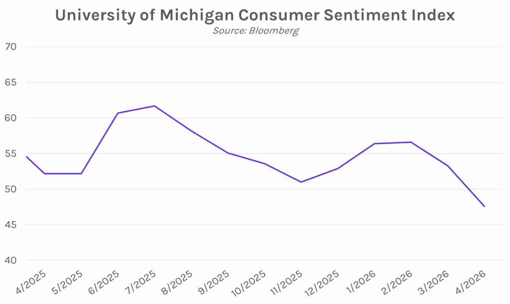 Yields rise ahead of US-Iran talks this weekend. Treasury yields initially dipped 1bp in the immediate aftermath of hot (but better than expected) CPI data, though price action quickly reversed course. Yields climbed throughout the remainder of the session as markets looked ahead to US-Iran negotiations this weekend. The 2-year yield closed 3 bps higher at 3.80% (down 4 bps on the week), while the 10-year yield closed 4 bps higher at 4.32% (down 2 bps on the week). Meanwhile, University of Michigan April consumer sentiment data plummeted to 47.6 from 53.3 in March, driven by inflation concerns from the Iran War, though the data did not trigger meaningful rates movement. Equities closed out their best week of 2026 so far, with the S&P 500 (6,817) and NASDAQ (22,903) up 3.56% and 4.68% on the week, respectively.