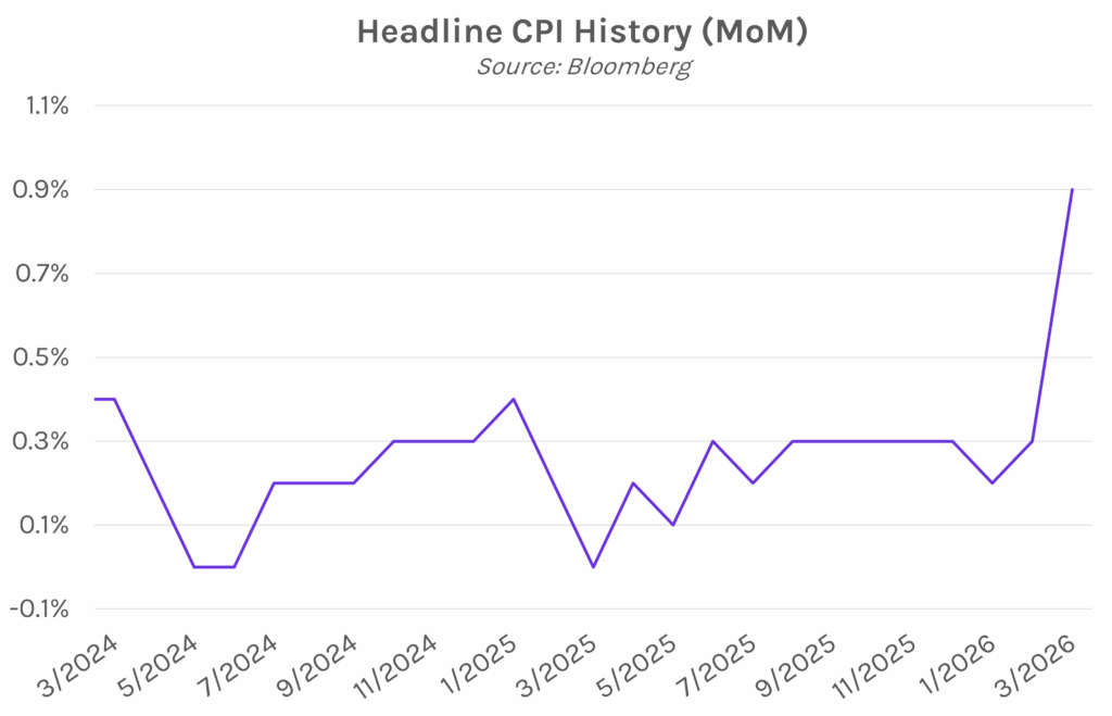 CPI surges on rising energy prices. US inflation rose sharply in March as the consumer price index increased 0.9% MoM, significantly above February’s 0.3% and the largest monthly increase since 2022. According to the BLS, nearly 75% of the increase was attributable to higher gas prices. Meanwhile, core CPI, which excludes volatile food and energy prices, rose just 0.2% MoM. On an annual basis, CPI increased 3.3%, up from 2.4% in the prior month and the fastest pace since 2024, while core CPI increased 2.6% YoY. Despite a 21% jump in gas prices, grocery costs fell 0.2% in March, as meat, dairy, and egg prices declined. Experts note it could take up to a year for the impact of fertilizer costs, an important input for grocery prices, to be fully reflected in CPI data. Airfares rose 2.7% from February, while used car prices declined for the fourth consecutive month.