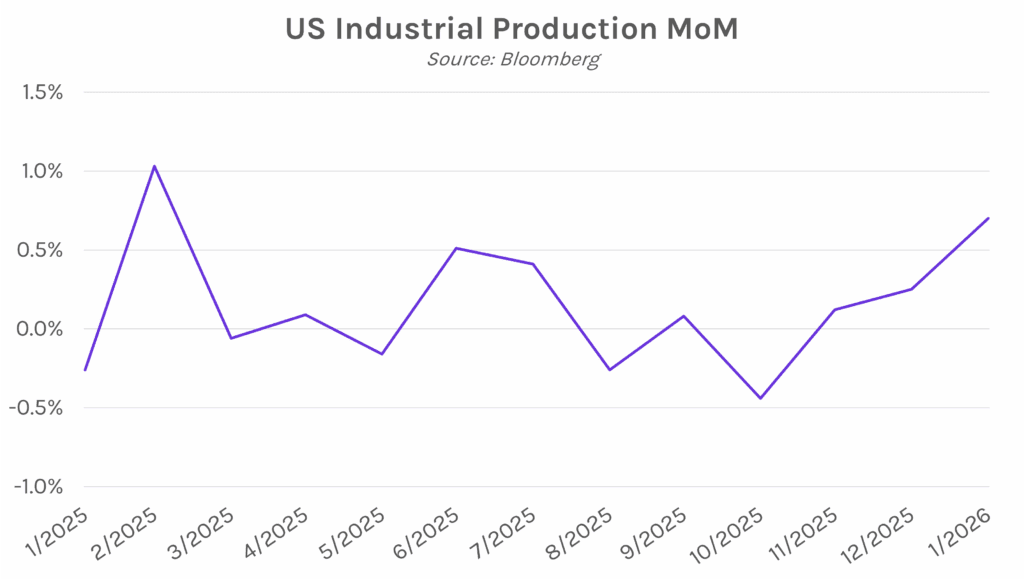 US industrial production increases by the most in nearly a year. Industrial production increased 0.7% in January, the largest gain in almost a year and above estimates of a 0.4% increase. The advance was driven by broad growth in manufacturing as well as an uptick in utility output. Capacity utilization, a measure of potential factory output being used, climbed to 75.6%, the highest level since September. Manufacturing output also rose 0.6%, the most since last February and a hopeful sign of recovery for US manufacturing activity. In a separate release today, December durable goods order fell by 1.4%, however the decline was smaller than estimates forecasting a 2.0% drop. Additionally, durable goods orders increased for communication equipment, computers, metals, and electrical equipment and machinery.