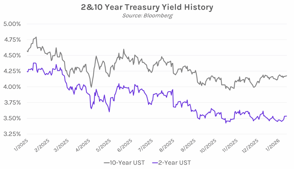 Yields flat ahead of CPI. The yield curve steepened overnight as markets digested news of the DOJ’s criminal investigation into the Fed, with long-term yields up 4 bps this morning on concerns about Fed independence. However, the move reversed over the remainder of the session, with yields closing nearly flat across the curve. The 2-year yield closed at 3.53% and the 10-year yield closed at 4.18%. Meanwhile, equities also rebounded from session lows, with the S&P 500 and NASDAQ closing up 0.16% and 0.26%, respectively.