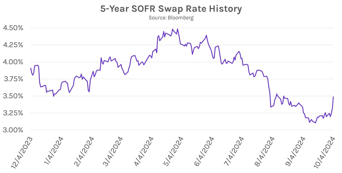 Yields surge after blowout jobs report. Markets re-evaluated bets on the size of upcoming Fed rate cuts after stronger than expected September labor data. Futures-implied odds of a 25bp cut in November climbed to ~93%, compared to ~68% yesterday. UST yields climbed ~7-22 bps across the long end of the curve, with the 2-year UST yield ending at ~3.92% and the 10-year UST yield ending at ~3.97%. Equities climbed on the data, with the S&P 500 up ~0.90% and the NASDAQ up ~1.22% on the day.