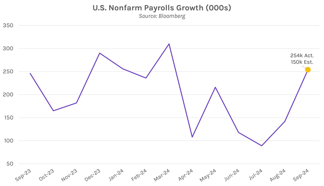 Job growth exceeds expectations. Data released today showed stronger than expected labor results in September. Nonfarm payrolls grew 254,000 during the month vs. 150,000 survey expectations and August’s 159,000 print (upwardly revised from 142,000). In addition, the unemployment rate declined slightly from 4.2% to 4.1%. Viewed alongside private payrolls and job openings data released earlier this week, the data alleviated some concerns about a prolonged labor market deterioration.