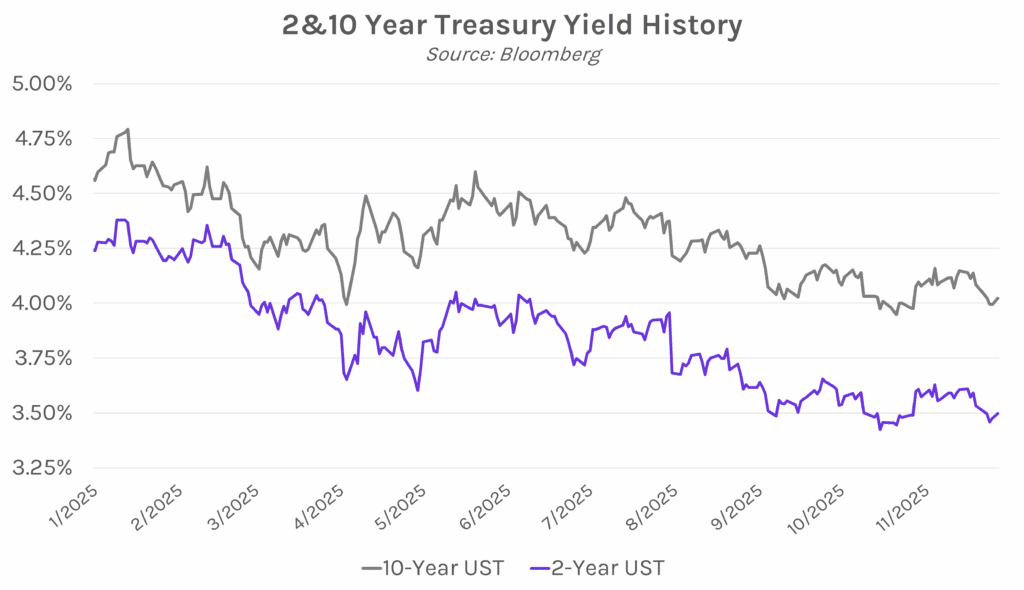 Yields close mixed as CME outage impacts flow. The Chicago Mercantile Exchange experienced a ~10-hour technical outage today, disrupting swap markets and tightening liquidity in the US bond market. Treasury yields were nearly unchanged from Wednesday’s close until CME’s futures and options markets resumed trading at 8:30 am EST. Yields ultimately closed 1-4 bps lower on the short end and 1-3 bps higher on the long end of the curve, with the 2-year yield at 3.49% (a 2 bp decline on the week), and the 10-year yield at 4.01% (a 5 bp decline on the week). Meanwhile, equities rose today with the S&P 500 and NASDAQ up 0.54% and 0.65%.
