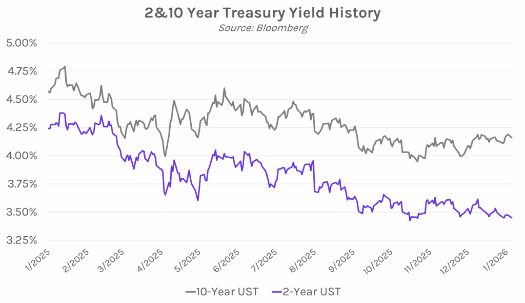 Yields decline, markets largely unperturbed by the capture of Venezuelan president. Treasury yields gradually declined today and closed within 4 bps of opening levels across the curve, with this weekend’s news of the US capture of Venezuelan leader Nicolás Maduro having a relatively subdued impact on rates. The 2-year yield closed 2 bps lower at 3.45% and the 10-year yield closed 3 bps lower at 4.16%. Oil reacted more strongly as WTI crude futures closed 1.7% higher following the Maduro news. Meanwhile, equities climbed as technology megacaps led gains, with the S&P 500 and NASDAQ up 0.64% and 0.69%, respectively.