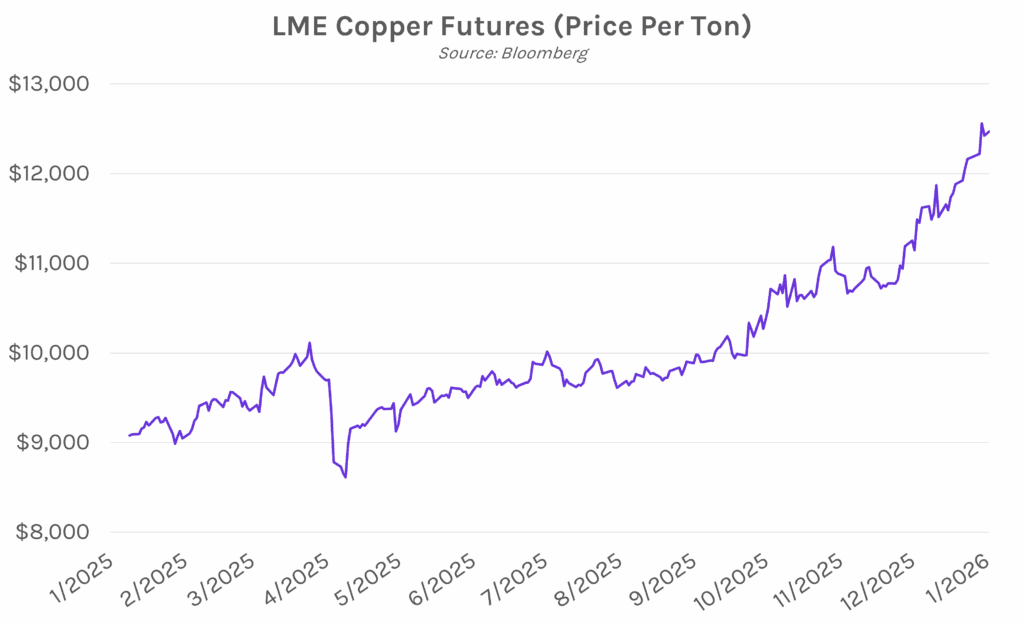 Copper hits a record $13,000 per ton, fueling supply shortage concerns. Copper prices broke $13,000 per ton for the first time ever as the London Metal Exchange (LME) benchmark rose 4% today, bringing gains to nearly 20% since November. The rally has been driven partly by uncertainty around President Trump’s tariff threats and a surge in US copper imports, pushing US prices to a premium over the LME and raising fears of tighter supply elsewhere. Investor demand was already strong given copper’s key role in everything from data centers to EV batteries. Additionally, the rally has been supported by a broader rise in precious metals as geopolitical turmoil boosts demand for safe-haven assets. The US capture of Venezuelan President Maduro, for one, has renewed concerns about critical mineral supply chains around the globe.