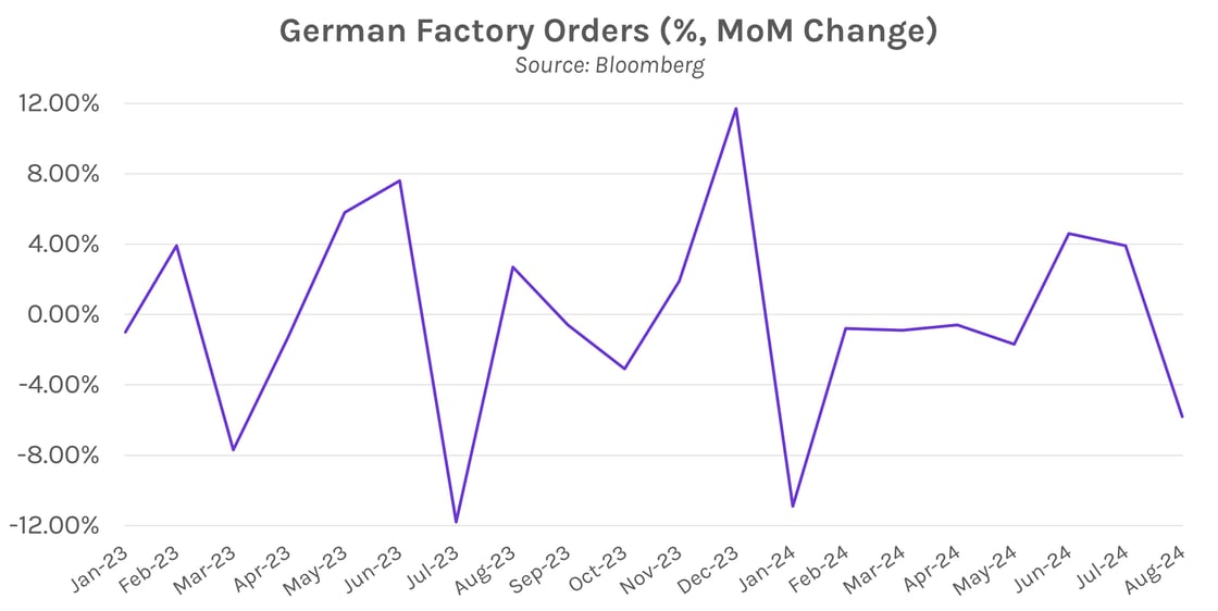 German manufacturing faces more setbacks in August. Data released today showed German factory orders fell 5.8% in August, the steepest decline since January’s 10.9% contraction. The results highlight the German manufacturing sector’s continued struggles ahead of upcoming economic data later this week, which will feature industrial production data and the government’s updated 2024 economic forecasts. German newspaper Seuddeutsche Zeitung reported this weekend that the government forecasts will likely show a 0.2% economic contraction during the year.