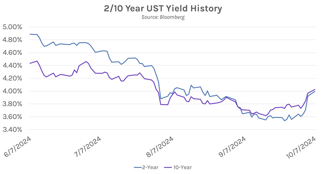Markets continue to digest labor data. Last Friday’s labor data remained top of mind today, driving a further UST selloff. UST yields climbed 6-7bps across the curve today, with the 10-year UST yield rising past 4% for the first time since early August. Equities declined today, driven by a broader technology selloff, with the S&P 500 falling ~1%, and the NASDAQ falling ~1.20%. Brent crude climbed as Middle East tensions continued to mount, climbing to $81.11 per barrel.