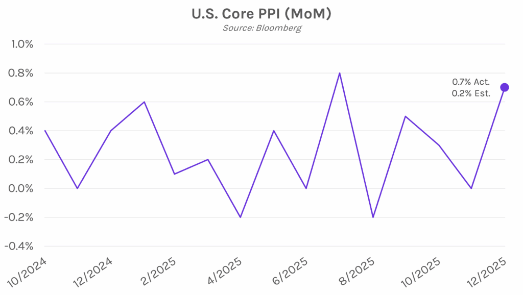 Wholesale prices rise, suggesting tariff costs are falling on consumers. Headline PPI for the month of December rose 0.5% MoM, above estimates and November’s level of 0.2%, marking the largest increase in three months. Core PPI, which excludes food and energy prices, rose 0.7%, one of the largest increases in a year that was well above forecasts of 0.2% and the prior month’s 0% stagnation. Prices also jumped on an annual basis, with headline PPI increasing 3% YoY and core PPI increasing 3.3% YoY, both above estimates of 2.8% and 2.9%, respectively. Services costs mostly drove December’s increase as hotel prices and airline fares ticked up. Prices of goods remained unchanged, but widening wholesale margins suggest that companies are increasingly passing tariff costs on to consumers. Some experts worry it is a sign that inflation may pick up in the months ahead.