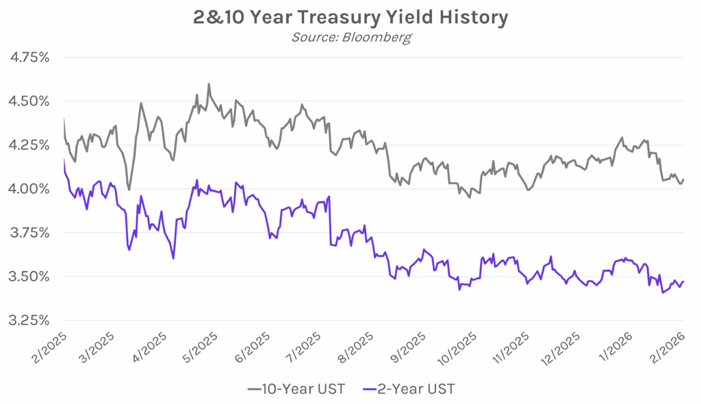 Yields rise as risk-on sentiment builds. Yields climbed as markets turned risk-on ahead of Nvidia’s after-market earnings report today, with relatively low demand in the $70B 5-year auction placing additional upward pressure. Yields closed 1-3 bps higher across the curve, with the 2-year yield at 3.47% and the 10-year yield at 4.05%. Meanwhile, equities rallied on strength in technology names, with the S&P 500 and NASDAQ closing 0.81% and 1.26% higher, respectively. Nvidia Corp. reported a strong earnings outlook, driving the stock over 4% higher in after-hours trading.