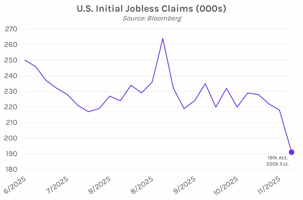 Initial jobless claims fall to three-year low. The number of unemployment benefit applications for the week ending November 29 came in at 191k, a three-year low that was below estimates of 220k and the prior week’s 216k. However, initial jobless claims figures are often choppy around the holidays. As Nancy Vanden Houten, lead economist at Oxford Economics, described, the data “can be subject to big swings at this time of year, so we won’t read too much into one week’s number.” The 4-week moving average, a figure that helps smooth out volatility, fell to 214.75k which is the lowest since January yet still hovering near the highest levels since 2021. Also released today, data from outplacement firm Challenger showed layoffs cooled in November, landing at 71k after October’s 153k surge. The Fed will weigh this week’s jobs data ahead of the December FOMC meeting, which begins on Tuesday.