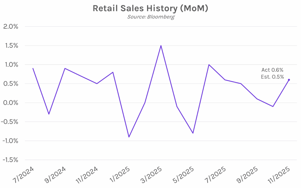 Retail sales jump by most since July. Headline retail sales increased 0.6% MoM in November, beating estimates of a 0.5% gain and landing well above October’s 0.1% decrease, which was downwardly revised from 0.0%. Marking the largest increase since July, the rebound in retail sales was driven mostly by autos and holiday shopping. Ten of thirteen categories saw increases, including sporting goods, building material retailers, and clothing outlets. Spending at restaurants and bars, the only service sector category in the report, saw a 0.6% increase against the prior month. Retail sales excluding autos also posted gains, increasing 0.5% MoM, above estimates of 0.4% and October’s 0.2% gain.