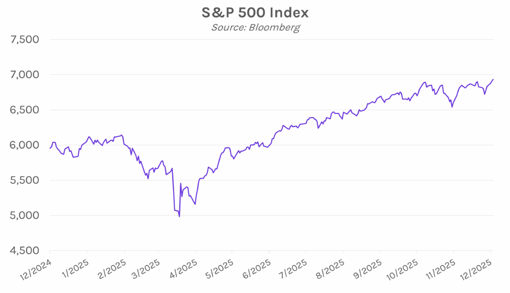 Rates inch lower on shortened trading day. Treasury yields traded in a tight 2-3 bp range this morning, with a muted reaction to slightly better-than-expected initial jobless claims data. A strong $44B 7-year treasury auction later helped push yields lower, with the 2-year yield closing 3 bps lower at 3.50% and the 10-year yield closing 3 bps lower at 4.13%. Meanwhile, the S&P 500 hit a new all-time high of 6,934.77, closing the day up 0.22%.