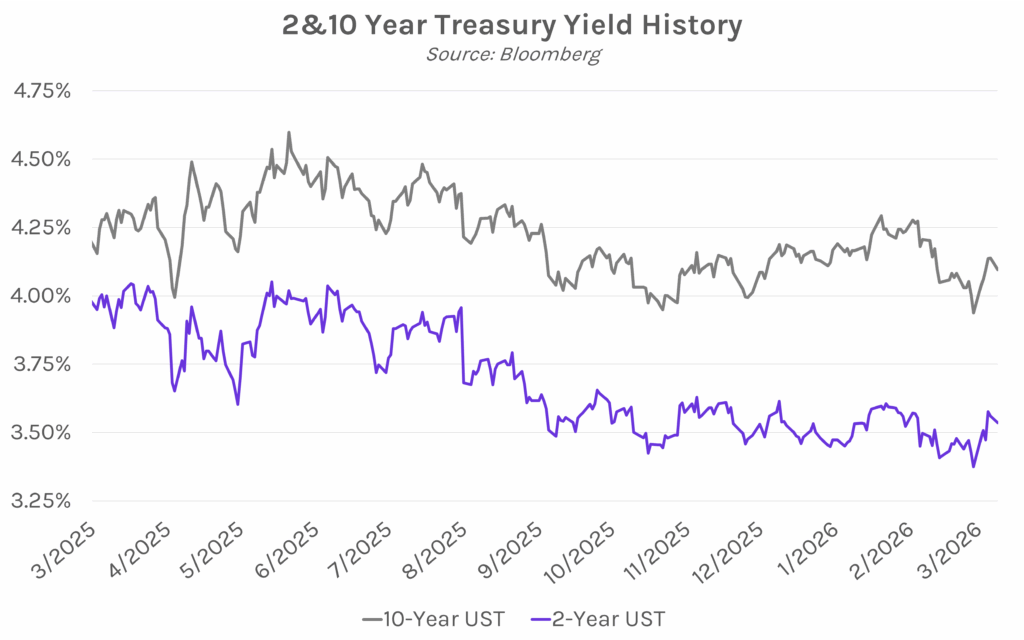 Yields decline as Trump hints war may end soon. Treasury yields climbed ~7 bps overnight alongside surging crude oil futures after Iran announced Mojtaba Khameni as their supreme leader. However, yields dropped 3-5 bps in the aftermath of Trump’s comments that suggested the war was progressing ahead of schedule, which also triggered a 13-15% drop in WTI and Brent crude futures. Yields ultimately closed 2-4 bps lower across the curve, with the 2-year yield at 3.54% and the 10-year yield at 4.10%. Meanwhile, stocks rallied on the positive comments from Trump, with the S&P 500 and NASDAQ closing 0.83% and 1.38% higher, respectively.