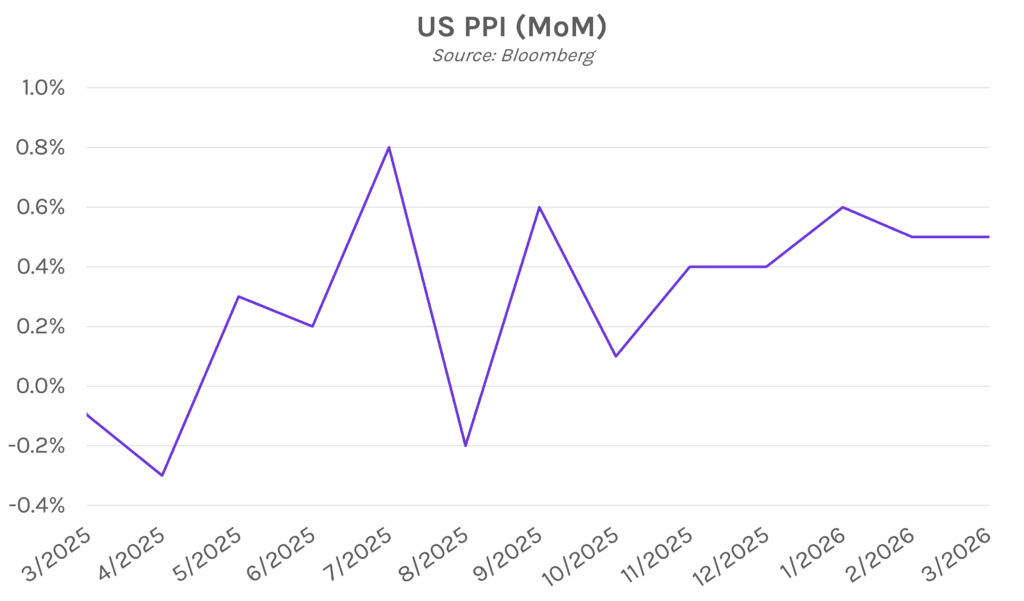 PPI rises less than expected despite surging energy costs. The producer price index increased 0.5% in March, significantly below the forecasted 1.1% rise and unchanged from the prior month. PPI excluding food and energy rose just 0.1% MoM, below expectations of 0.4%. On an annualized basis, headline PPI increased 4.0%, while PPI excluding food and energy increased 3.8%, both below estimates of 4.6% and 4.1%, respectively. Samuel Tombs, chief US economist at Pantheon Macroeconomics, noted, “The modest rise in the core PPI in March brings some genuinely good news,” though he caveated that “PPI energy prices will rise considerably further in April.” Many experts remain concerned about US inflation and energy prices, as the effects of the Iran conflict have yet to be fully realized.