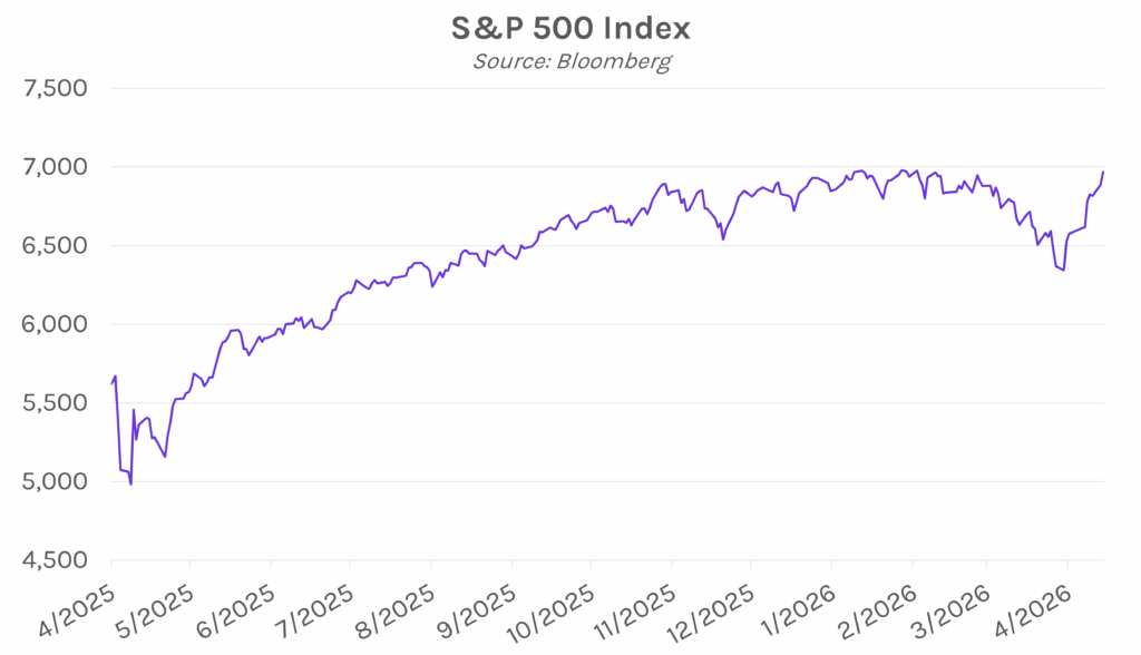 Yields fall on continued hope for a US-Iran deal. Market volatility was muted in the aftermath of softer-than-expected March PPI data this morning, with yields initially dipping slightly before rising ~3 bps to intraday highs. Yields then declined throughout the remainder of the session on lasting hopes that a US-Iran peace deal could be achieved in an upcoming round of negotiations. The 2-year yield closed 3 bps lower at 3.75% while the 10-year yield closed 5 bps lower at 4.25%. Meanwhile, equities rallied, with the S&P 500 up 1.18% today, now near its all-time high of 6,978.60. Oil prices also saw some relief on optimism for a resolution to the war, with WTI crude trading around $92 per barrel, down from $99.08 at yesterday’s close.
