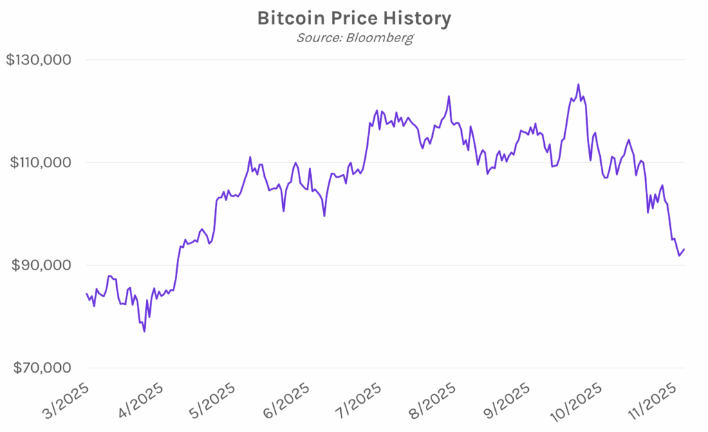 Yields fall on labor data as markets await Nvidia earnings. Treasury yields declined today as markets got another glimpse into the state of the labor market following the government shutdown. Jobless claims showed 232,000 initial unemployment benefit applications for the week ending October 18, 13k above recent lows, while ADP data showed declines in private payrolls on average for the four weeks ending November 1. The 2-year yield closed 4 bps lower at 3.57%, and the 10-year closed 3 bps lower at 4.11%. Meanwhile, equities declined on a sell-off in technology names ahead of tomorrow’s Nvidia earnings, with the S&P 500 closing 0.83% lower, down for the fourth straight day. Bitcoin rebounded after briefly falling below $90,000, currently up 1.14% on the day.