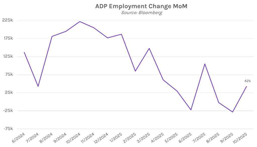 ADP Research data shows 2.5k weekly job losses last month. ADP data released today reported private payrolls shedding an average 2.5k jobs per week for the four weeks ending November 1. Bigger picture, the data showed the labor market losing momentum in October, though preliminary figures point to the rate of losses seeming to slow thus far in November. Concern for the labor market, however, continues to grow, as 55% of employed Americans now report being concerned about losing their job. ADP private payrolls have become increasingly important in recent weeks as government data has been delayed by the shutdown, however the BLS is expected to finally release September labor data on Thursday, with estimates foreseeing 55k jobs added versus the prior month.