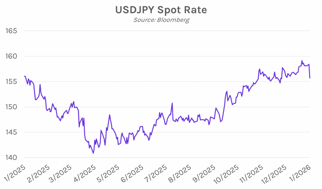 Yen falls near 18-month low. The Japanese yen was volatile today, posting two sudden spikes as the currency weakened to 159.2 per dollar. The level, near 18-month lows, occurred during Governor Ueda’s press conference announcing that the BOJ held policy rates steady. A short while later, the yen suddenly strengthened to 157.3 per dollar, causing markets to speculate that authorities had conducted a rate check. Rate checks, when BOJ authorities informally asses market interest rates with banks, are often a precursor to monetary policy intervention. Since Prime Minister Takaichi took over in October, the yen has fallen more than 4% on fiscal concerns, fueling concerns about intervention.