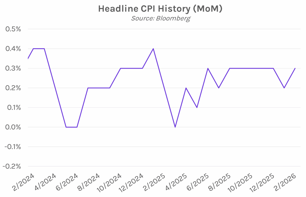 Pre-war inflation data cooled as expected. Februaryconsumer price index data showed inflation easing in line with expectations before the war in Iran began. Headline CPI rose 0.3% MoM, higher than January’s 0.2% increase but matching estimates. Core CPI, which excludes volatile food and energy prices, rose 0.2% MoM, also in line with forecasts. Year-over-year, CPI and core CPI increased 2.4% and 2.5%, respectively. Today’s report showed that reduced used car, auto insurance, and housing prices helped keep inflation in check, even as gasoline and grocery prices climbed. US inflation has generally trended downwards in recent months, although the conflict in the Middle East has revived price concerns. Oil, gas, and fertilizer costs have already risen significantly in the first eleven days of the war. Carl Weinberg, chief economist at High Frequency Economics, believes higher energy prices will raise trucking and airfare costs and also flow through to food and other goods.