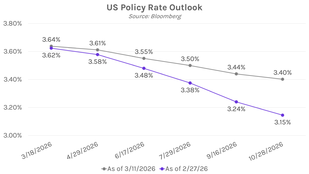 Yields climb as oil rally continues. Treasury yields rose over the course of today’s session on inflation concerns as oil continues to rally on the war in Iran. Despite a tame CPI print today, futures markets are only pricing in one 25 bp rate cut this year because of the oil-driven inflation risk, versus between 2-3 cuts prior to the war’s outbreak. Yields closed 6-9 bps higher across the curve, with the 2-year yield at 3.65% and the 10-year yield at 4.23%. Meanwhile, equities were little changed, with the S&P 500 closing 0.08% lower and the NASDAQ closing 0.08% higher.
