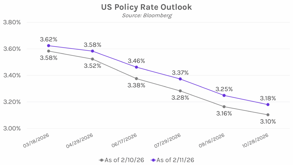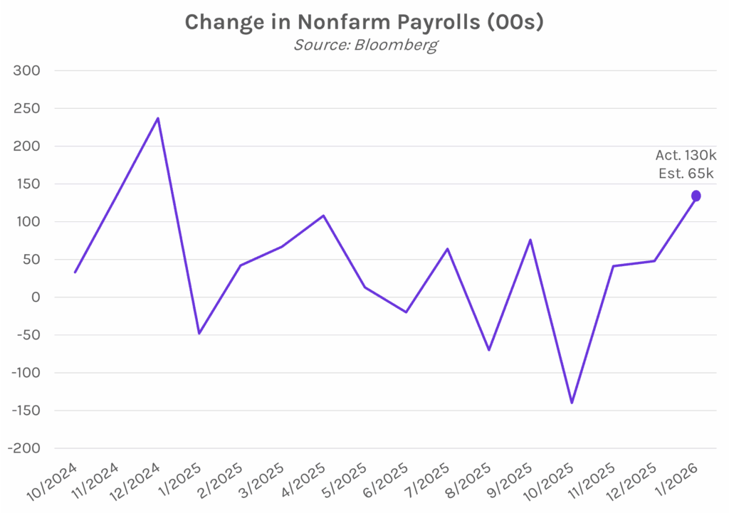 January payrolls show surprise labor market strength. Nonfarm payrolls unexpectedly showed 130k jobs added in January, doubling estimates of 65k jobs and above December’s downward revision showing a 48k increase. The level was the highest in over a year and the first time since late 2024 that US factory employment has increased. While offering a welcome sign that manufacturing activity may be picking up, US employment growth remains concentrated in healthcare sectors. Also of note, the January unemployment rate unexpectedly declined, ticking down to 4.3% versus 4.4% in December. Meanwhile, private payrolls added 172k jobs versus estimates of 68k and the prior month’s upwardly revised 64k jobs. On the whole, today’s release pared market expectations of policy rate cuts this year, reinforcing Fed comments from last month that pointed to a stabilizing labor market as reason to hold rates steady.
