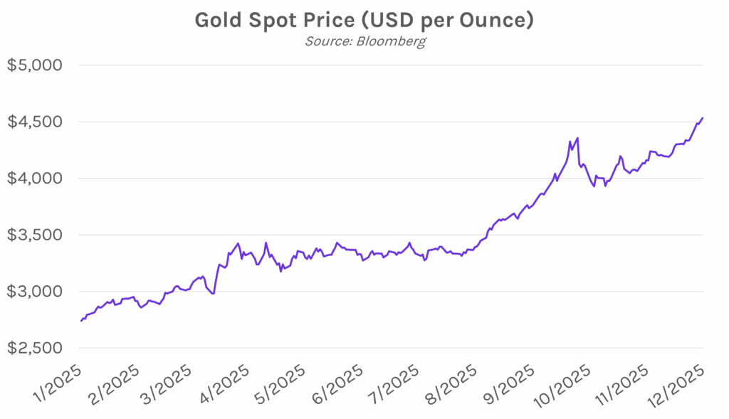 Gold, silver, and platinum hit all-time highs. Spot gold climbed 1.6% to trade above $4,540 an ounce today, while silver jumped 7.7% to break above $77 an ounce, underscoring renewed interest in safe-haven assets. Platinum also reached an all-time high of $2,437 an ounce. The rally comes on the back of rising geopolitical tensions, including the US blockade of oil tankers near Venezuela and the Trump Administration’s strikes targeting Islamic State affiliates in Nigeria. On the year, gold is up roughly 70% and silver has gained about 150%, marking their strongest annual performances since 1979. Gains have also been fueled by elevated central bank purchases, continued ETF inflows, and support from the Federal Reserve’s three interest rate cuts this year.