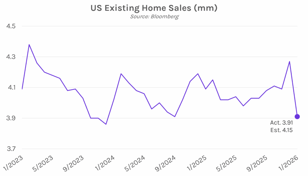 Existing home sales fall by 8.4%. Previously owned US homes sales totaled 3.91mm in January, an 8.4% decrease from December and the largest decline in four years. Experts partially attribute the slump to January’s extreme winter weather, which caused delays with contract closings. Notably, existing home sales in the south fell by 9%, the most of any region. However, one possible bright spot in the housing market is recent signs of improving affordability. The National Association of Realtors housing affordability measure increased in January to the highest level since 2022, though it remains below pre-pandemic levels.