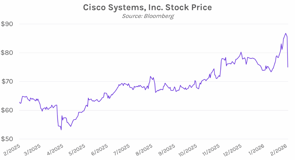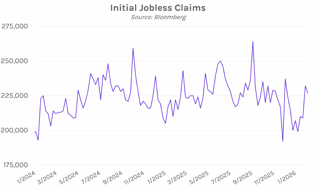 Jobless claims inch lower following hot January job report. Initial jobless claims data came in slightly above expectations today at 227k, a slight improvement from the prior week’s 231k. Continuing claims edged higher from 1.84 million people receiving benefits previously to 1.86 million. Weekly claims data tends to fluctuate due to severe weather, and the slight improvement in new claims suggests that people were able to resume work following the recent winter storm that impacted large areas of the country. Today’s print comes after yesterday’s January labor data showed a strong increase in payrolls and a falling unemployment rate, which further delayed expectations for 2026 rate cuts.