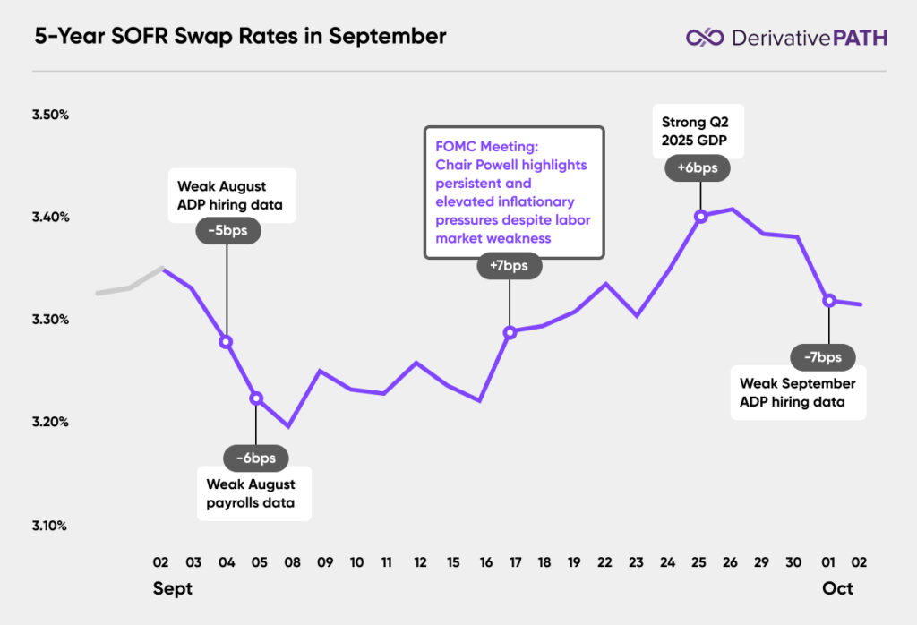 Insights October 3, 2025 Swap Rates Rundown Sahil Pankhaniya Associate September and Early October 2025 Highlights 3 Things to Know: Weak labor data sends rates to new lows. Rates fell ~15 basis points to set new year-to-date lows during the first week of September after weak labor data. Government labor data wasn’t released in October due to the ongoing shutdown, but rates fell ~7 basis points to start the month after disappointing private-sector labor releases. Powell concerned about inflation. As expected, the Fed delivered a 25 basis point rate cut in September. Longer-term rates rose, however, after Chair Powell struck an unexpectedly hawkish tone due to persistent and elevated inflationary pressures. U.S. economy grows.Gross Domestic Product grew by 3.8% in the second quarter of 2025, the fastest in 2-years, powered by higher consumer spending and business investment. The strong results drove rates ~6 basis points higher the day of the release despite a weakening labor market. Explore More: August ADP Data (-5 bps) August Payrolls Data (-6 bps) September FOMC Meeting (+7 bps) Second Quarter 2025 GDP (+6 bps) September ADP Data (-7 bps) Contact us:415-992-8200[email protected]